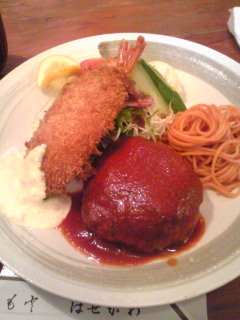 ハンバーグと海老フライのAミックス1400円とホットコーヒー350円を注文。