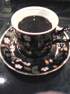 ほんとはこのテーブルは綺麗なグリーンと黒なんだけど照明の関係でこんな暗い写真になってしまった。カップの色も冴えない写りで縁の金色は白になってるし。残念。