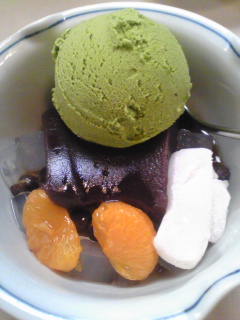 私は抹茶あんみつ。590円だったかな?一緒に行った人はクリーム白玉あんみつ。630円位だった。
