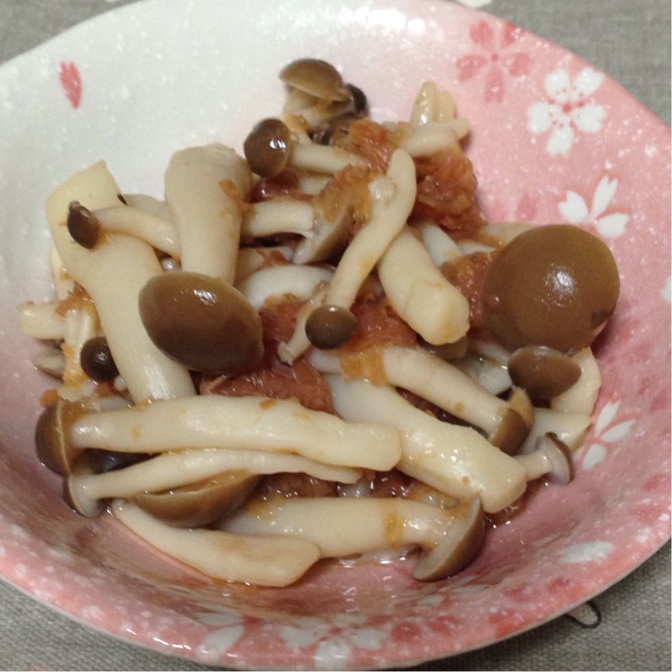 2パック分のしめじを少量の水、だし、梅干し2個、あとほんの少しだけみりんと醤油を入れて10分くらい煮る。そしてかつお節を2パック入れて、少し煮詰めて出来上がり。カツ代さんのレシピでは出汁はなくて酒と醤油での味付けなんだ。私はだしをいれたので、醤油はピュッ!て程度にしたよ。