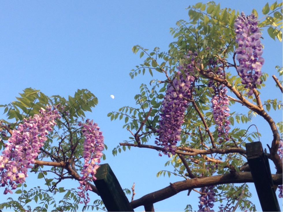家までの帰り道、公園の藤をちょっと眺めた。もう少しで盛りかな?藤の色って大好き。そして満月はあと1週間ほどか。